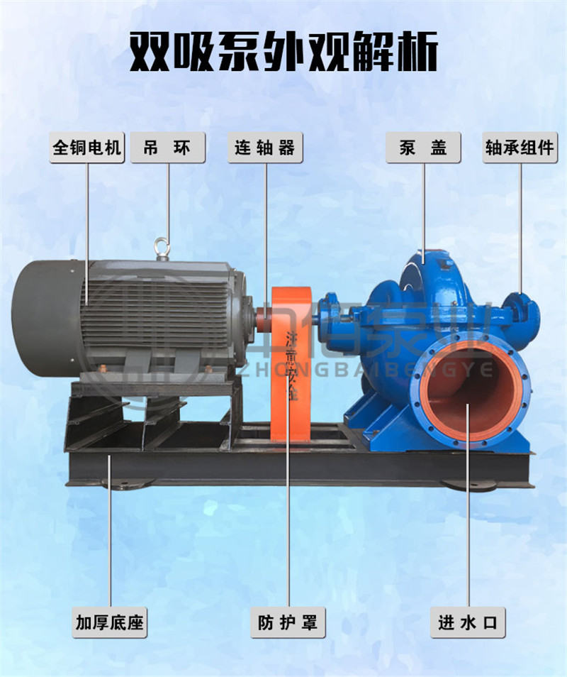 S型單級雙吸清水離心泵結構緊湊、穩定性好。該型泵為泵殼中開結構,進出口均在泵體上,檢修時只需吊出泵蓋,轉子部件便可移出進行檢修作業,而不需拆卸管路,十分方便。