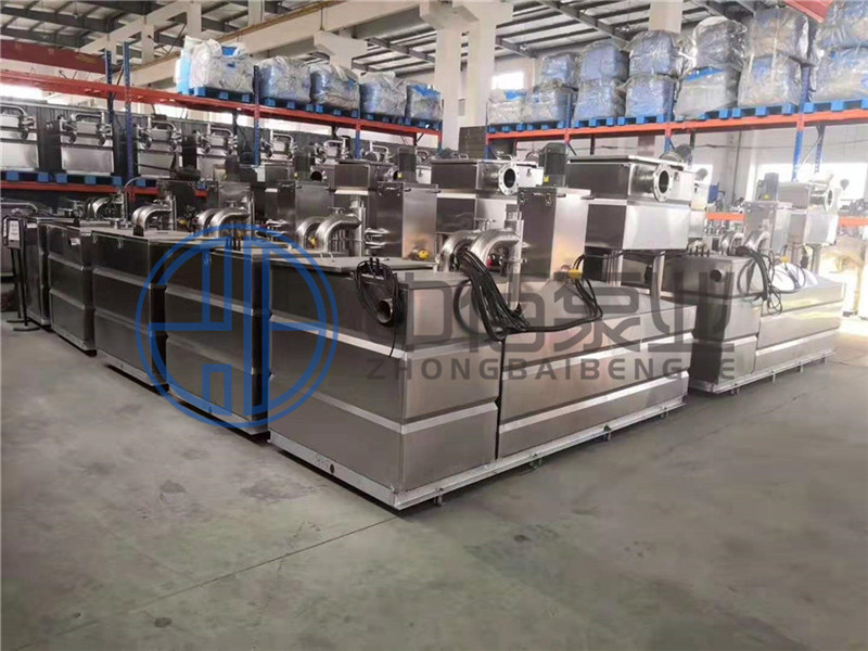 2、廢水在油水分離倉(cāng)中,利用油水密度差原理,油污自動(dòng)上浮到特制的集油裝置中,集油裝置頂部設(shè)置的放油閥與廢油收集桶連接,浮油在集油裝置中儲(chǔ)存達(dá)到一定高度時(shí),打開放油閥,浮油自行流入設(shè)備旁邊放置的廢油收集桶中。油水分離倉(cāng)中可選配全自動(dòng)微氣泡發(fā)生器,加快油水分離速度,有利于油水充分分離。油水分離倉(cāng)配有專用電加熱恒溫裝置,使油脂在較低溫度環(huán)境下不會(huì)發(fā)生板結(jié)。收集的廢油定期轉(zhuǎn)移至允許傾倒的地方。油水分離倉(cāng)內(nèi)的液位達(dá)到一定高度時(shí),污水在壓力作用下通過回流管流入污水提升倉(cāng)。